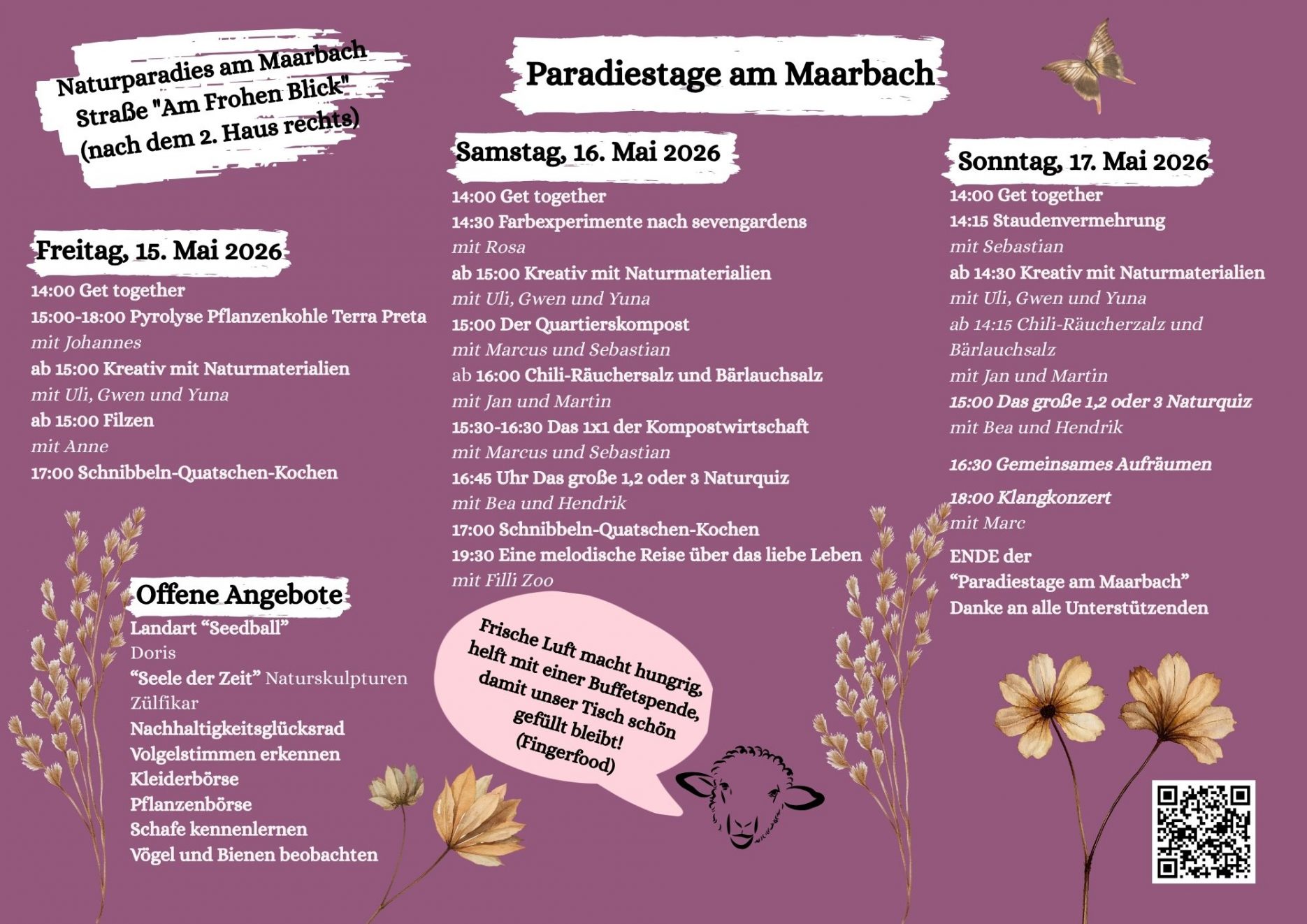 Die Paradiestage am Maarbach finden im Rahmen der Nachhaltigkeitswochen Hamme vom 15. – 17. Mai 2026 täglich ab 14: Uhr im Naturparadies am Maarbach statt. An den Mitmachtagen rund um Garten, Nachhaltigkeit und Natur bieten die verschiedenen Workshops und Angebote die Möglichkeit dazu zulernen, sich selber auszuprobieren und neue Dinge kennenzulernen.